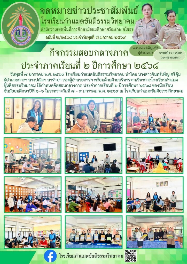 วันพุธที่ ๗ มกราคม พ.ศ. ๒๕๖๙ โรงเรียนกำแมดขันติธรรมวิทยาคม นำโดย นางสาวจันทร์เพ็ญ ศรีคุ้ม ผู้อำนวยการฯ นางปณิตา นาจำปา รองผู้อำนวยการฯ พร้อมด้วยฝ่ายบริหารงานวิชาการโรงเรียนกำแมดขันติธรรมวิทยาคม ได้กำหนดจัดสอบกลางภาค ประจำภาคเรียนที่ ๒ ปีการศึกษา ๒๕๖๘ ของนักเรียนชั้นมัธยมศึกษาปีที่ ๑–๖ ในระหว่างวันที่ ๗ – ๙ มกราคม พ.ศ. ๒๕๖๙ ณ โรงเรียนกำแมดขันติธรรมวิทยาคม
