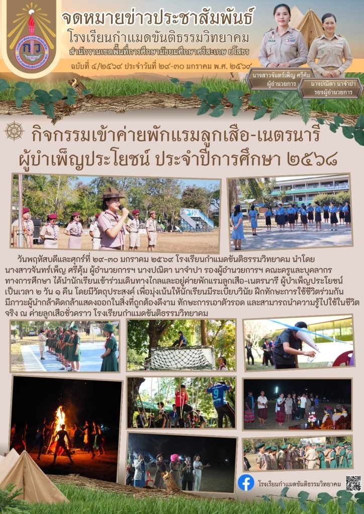 วันพฤหัสบดีและศุกร์ที่ ๒๙-๓๐ มกราคม ๒๕๖๙ โรงเรียนกำแมดขันติธรรมวิทยาคม นำโดย นางสาวจันทร์เพ็ญ ศรีคุ้ม ผู้อำนวยการฯ นางปณิตา นาจำปา รองผู้อำนวยการฯ คณะครูและบุคลากรทางการศึกษา ได้นำนักเรียนเข้าร่วมเดินทางไกลและอยู่ค่ายพักแรมลูกเสือ-เนตรนารี ผู้บำเพ็ญประโยชน์ เป็นเวลา ๒ วัน ๑ คืน โดยมีวัตถุประสงค์ เพื่อมุ่งเน้นให้นักเรียนมีระเบียบวินัย ฝึกทักษะการใช้ชีวิตร่วมกัน มีภาวะผู้นำกล้าคิดกล้าแสดงออกในสิ่งที่ถูกต้องดีงาม ทักษะการเอาตัวรอด และสามารถนำความรู้ไปใช้ในชีวิตจริง ณ ค่ายลูกเสือชั่วคราว โรงเรียนกำแมดขันติธรรมวิทยาคม