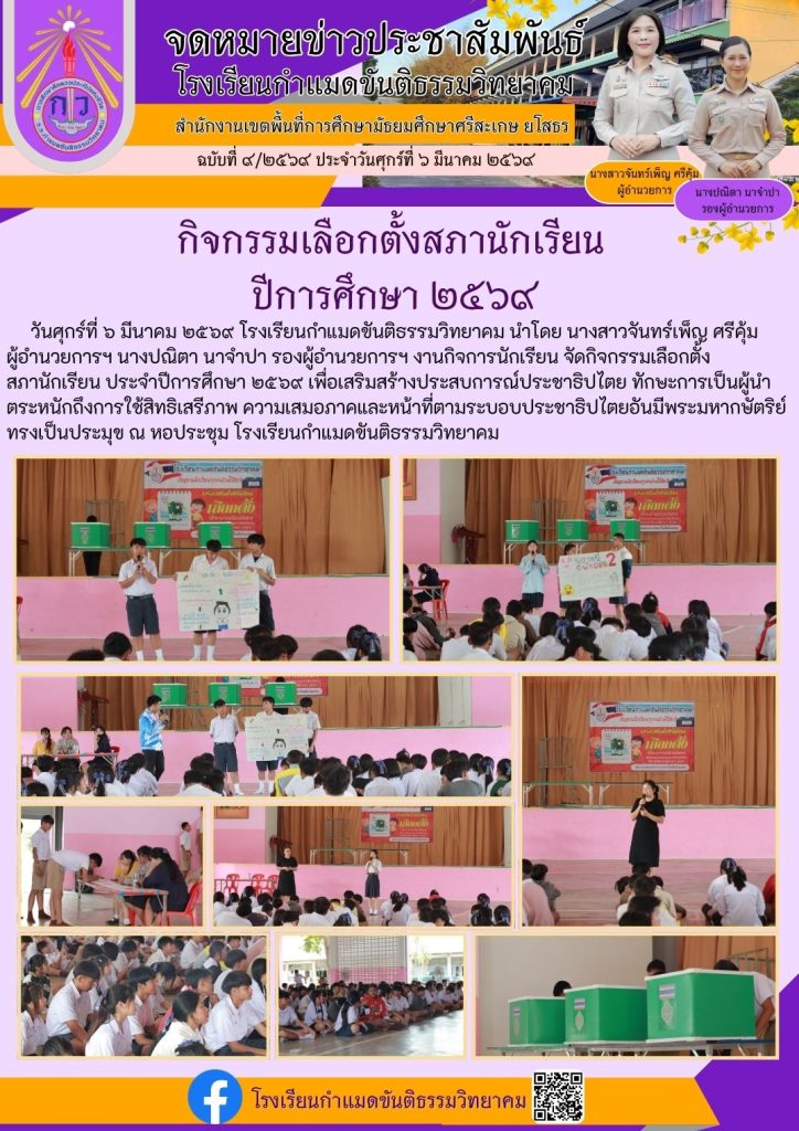 วันศุกร์ที่ ๖ มีนาคม ๒๕๖๙ โรงเรียนกำแมดขันติธรรมวิทยาคม นำโดย นางสาวจันทร์เพ็ญ ศรีคุ้ม ผู้อำนวยการฯ นางปณิตา นาจำปา รองผู้อำนวยการฯ งานกิจการนักเรียน จัดกิจกรรมเลือกตั้งสภานักเรียน ประจำปีการศึกษา ๒๕๖๙ เพื่อเสริมสร้างประสบการณ์ประชาธิปไตย ทักษะการเป็นผู้นำ ตระหนักถึงการใช้สิทธิเสรีภาพ ความเสมอภาคและหน้าที่ตามระบอบประชาธิปไตยอันมีพระมหากษัตริย์ทรงเป็นประมุข ณ หอประชุม โรงเรียนกำแมดขันติธรรมวิทยาคม