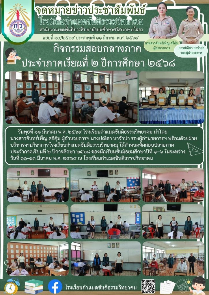 วันพุธที่ ๑๑ มีนาคม พ.ศ. ๒๕๖๙ โรงเรียนกำแมดขันติธรรมวิทยาคม นำโดย นางสาวจันทร์เพ็ญ ศรีคุ้ม ผู้อำนวยการฯ นางปณิตา นาจำปา รองผู้อำนวยการฯ พร้อมด้วยฝ่ายบริหารงานวิชาการโรงเรียนกำแมดขันติธรรมวิทยาคม ได้กำหนดจัดสอบปลายภาค ประจำภาคเรียนที่ ๒ ปีการศึกษา ๒๕๖๘ ของนักเรียนชั้นมัธยมศึกษาปีที่ ๑–๖ ในระหว่างวันที่ ๑๑-๑๓ มีนาคม พ.ศ. ๒๕๖๙ ณ โรงเรียนกำแมดขันติธรรมวิทยาคม