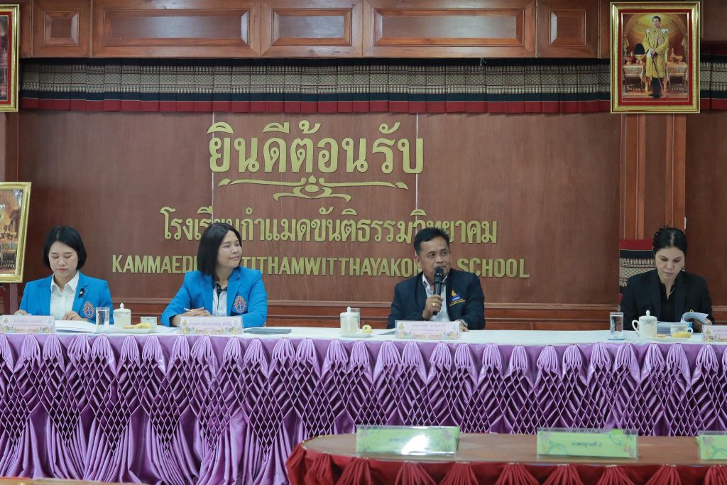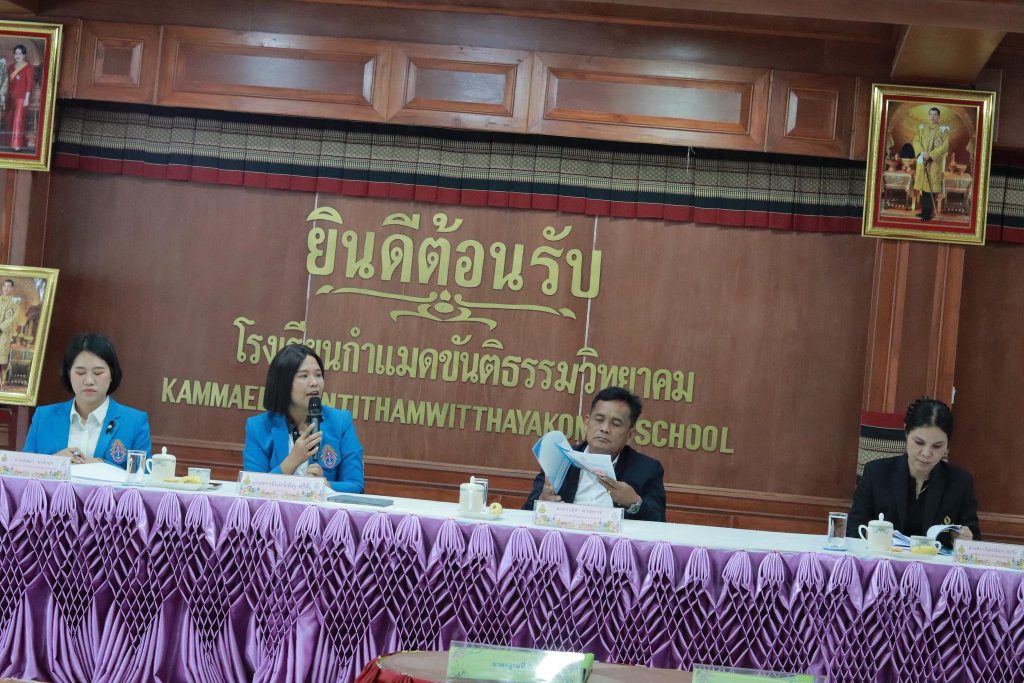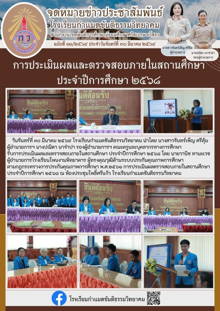 วันจันทร์ที่ ๓๐ มีนาคม ๒๕๖๙ โรงเรียนกำแมดขันติธรรมวิทยาคม นำโดย นางสาวจันทร์เพ็ญ ศรีคุ้ม ผู้อำนวยการฯ นางปณิตา นาจำปา รองผู้อำนวยการฯ คณะครูและบุคลากรทางการศึกษา รับการประเมินผลและตรวจสอบภายในสถานศึกษา ประจำปีการศึกษา ๒๕๖๘ โดย นายวานิช ทานะเวช ผู้อำนวยการโรงเรียนโพนงามพิทยาคาร ผู้ทรงคุณวุฒิด้านระบบประกันคุณภาพการศึกษา ตามกฎกระทรวงการประกันคุณภาพการศึกษา พ.ศ.๒๕๖๑ การประเมินผลตรวจสอบภายในสถานศึกษา ประจำปีการศึกษา ๒๕๖๘ ณ ห้องประชุมโพธิ์ศรีแก้ว โรงเรียนกำแมดขันติธรรมวิทยาคม